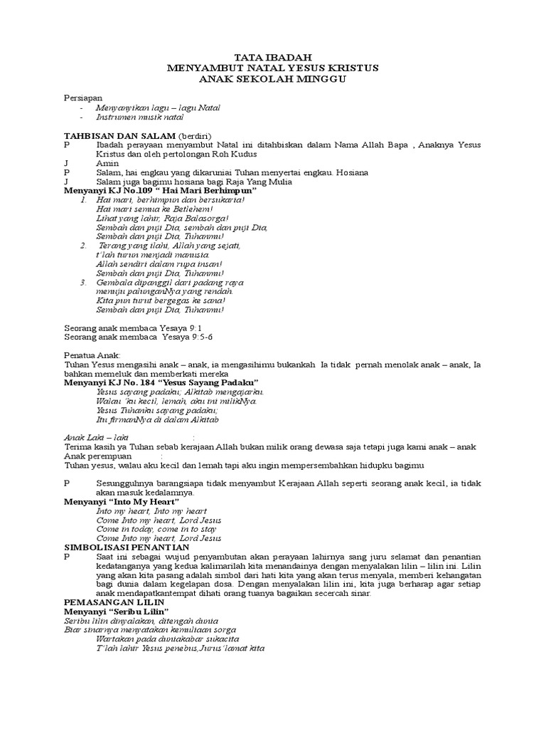 Karena setiap guru sm mempunyai kreativitas yang adalah karunia tuhan untuk terus berkembang dalam bidang pelayanan anak sm. Mj menyambut dan mempersilahkan semua jemaat yang datang beribadah untuk mengambil tempat. Persiapan ibadah saat teduh 1. Liturgi ibadah natal i, 25 desember 2014. Dari sekarang sampai hari tuhan tiba.
